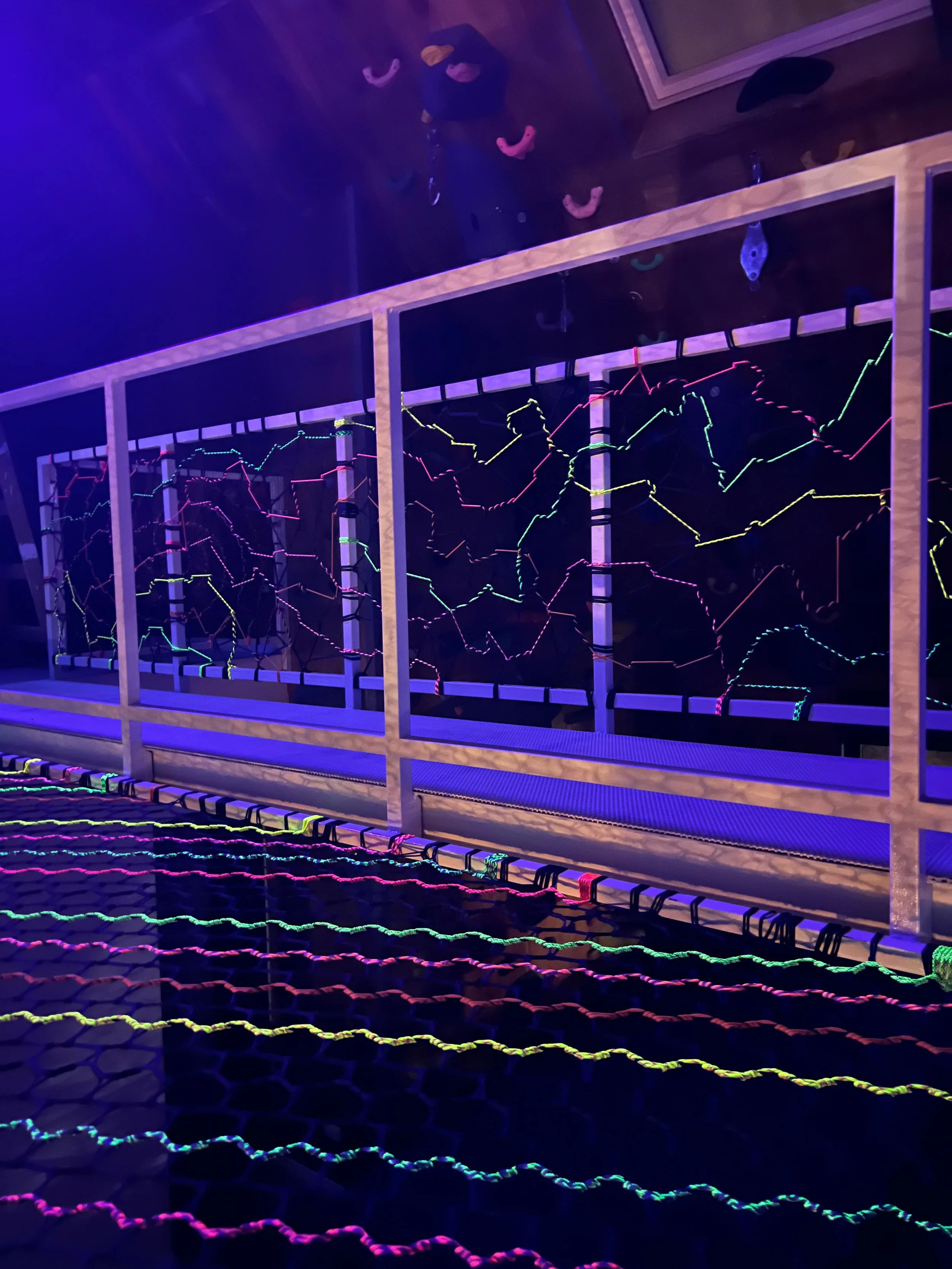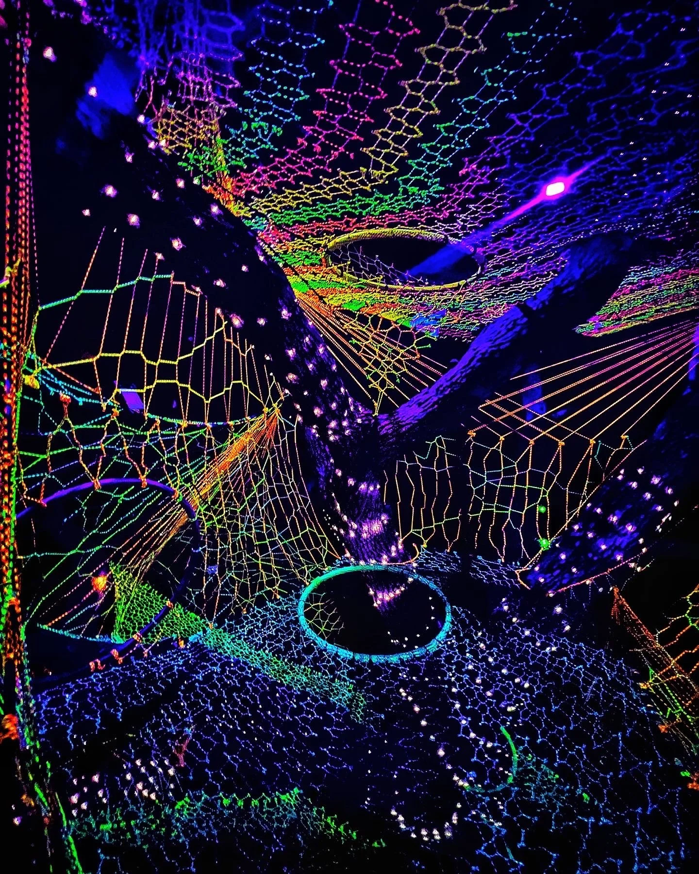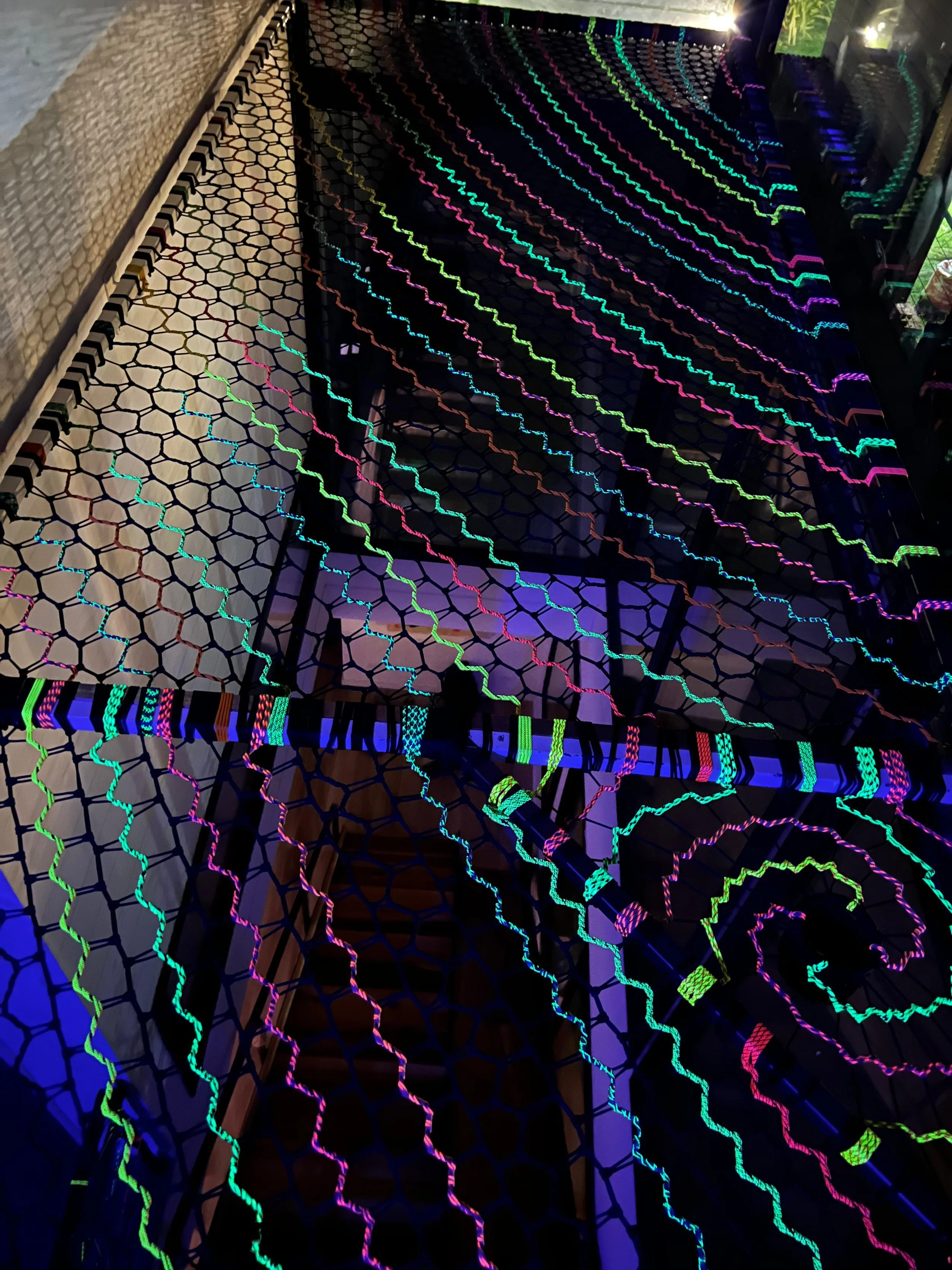 We transformed this Buenos Aires loft into the ultimate UV-reactive family hangout spot. What was once a climbing room is now a suspended net lounge with matching handrails — handwoven to complement the home’s architecture and color palette. At night, the black cord fades away, leaving a floating world of glowing color and light. This project captures what we love most: turning unique spaces into interactive art.