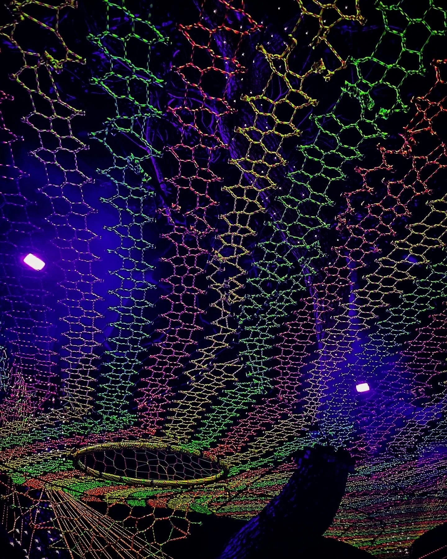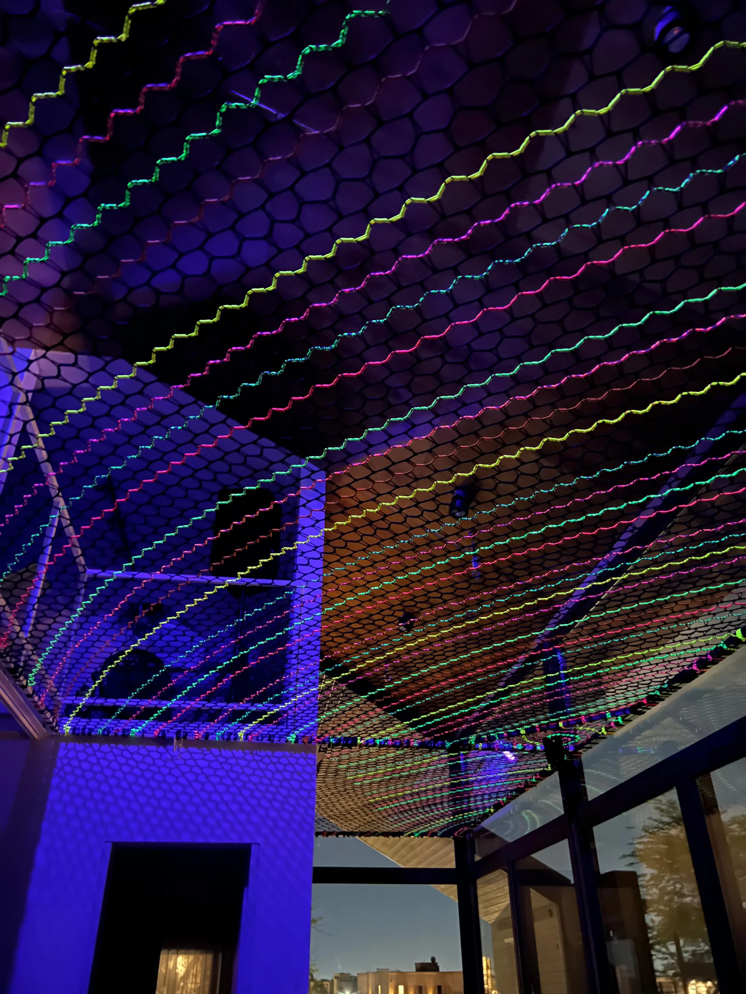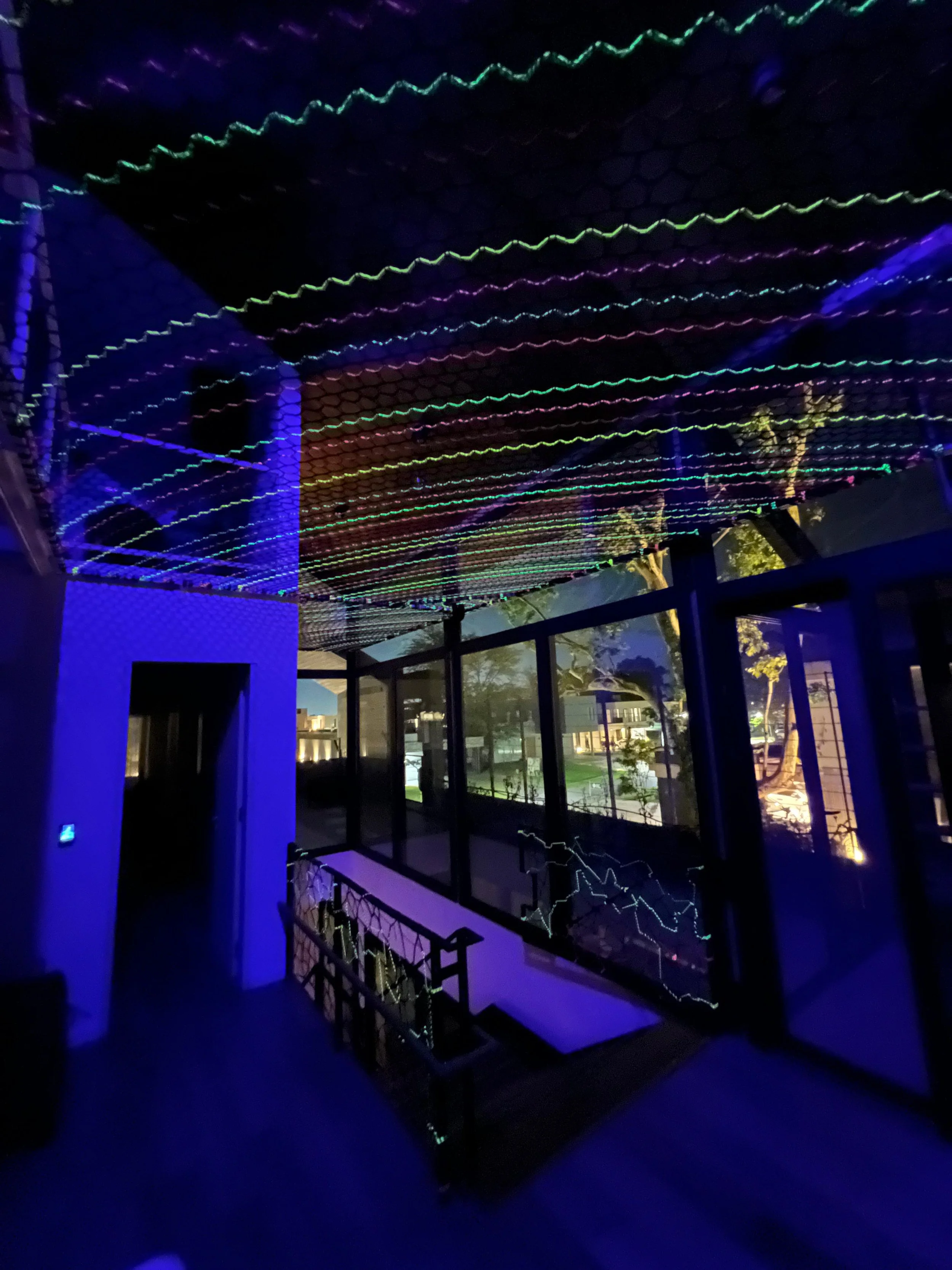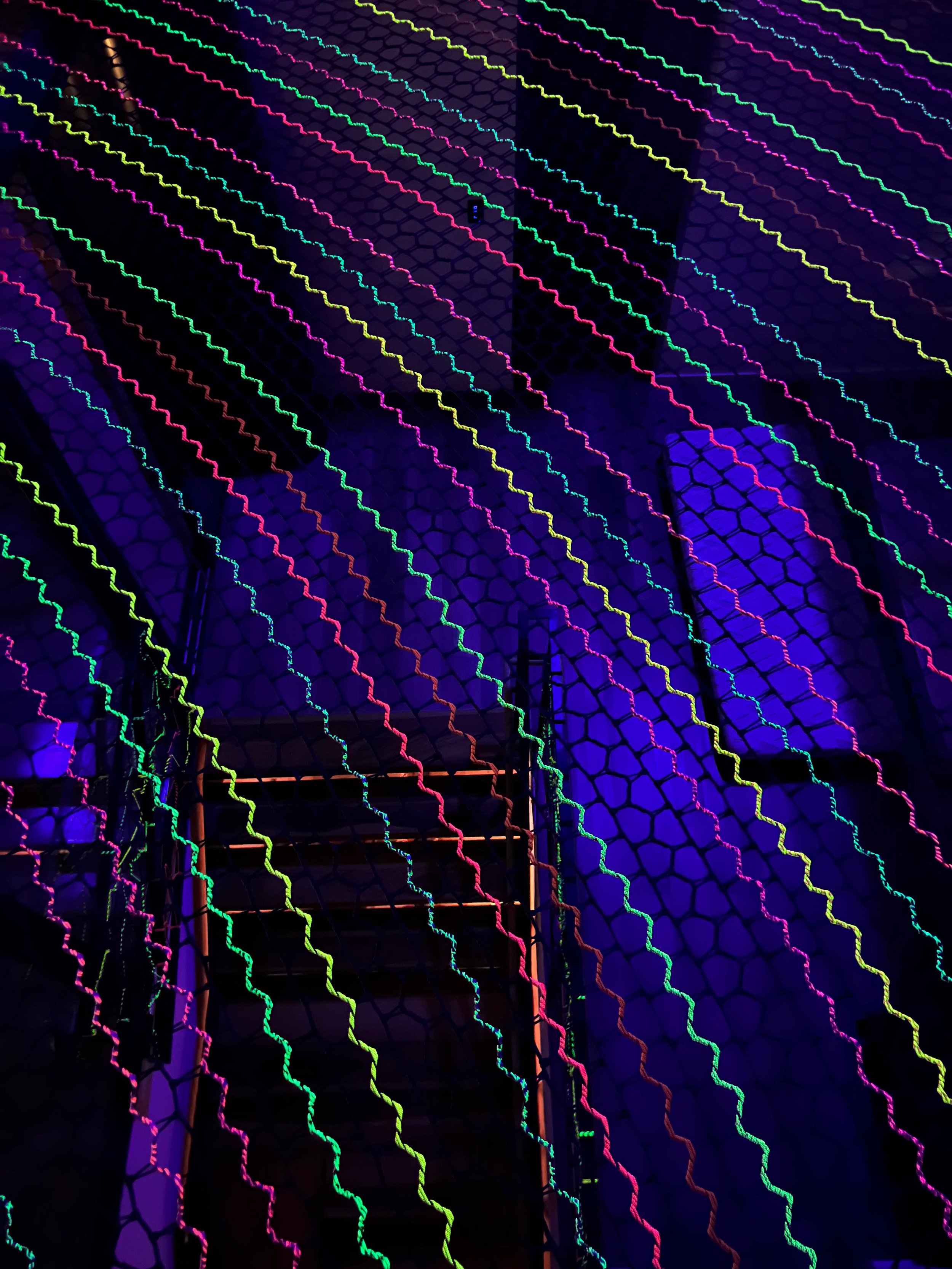 We transformed this Buenos Aires loft into the ultimate UV-reactive family hangout spot. What was once a climbing room is now a suspended net lounge with matching handrails — handwoven to complement the home’s architecture and color palette. At night, the black cord fades away, leaving a floating world of glowing color and light. This project captures what we love most: turning unique spaces into interactive art.
