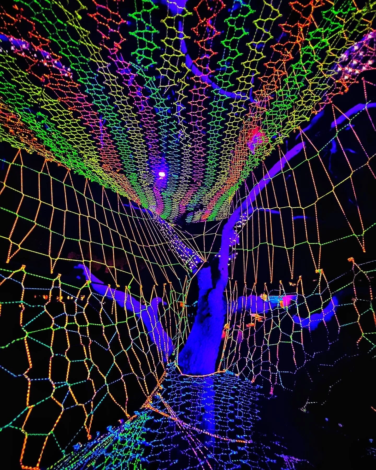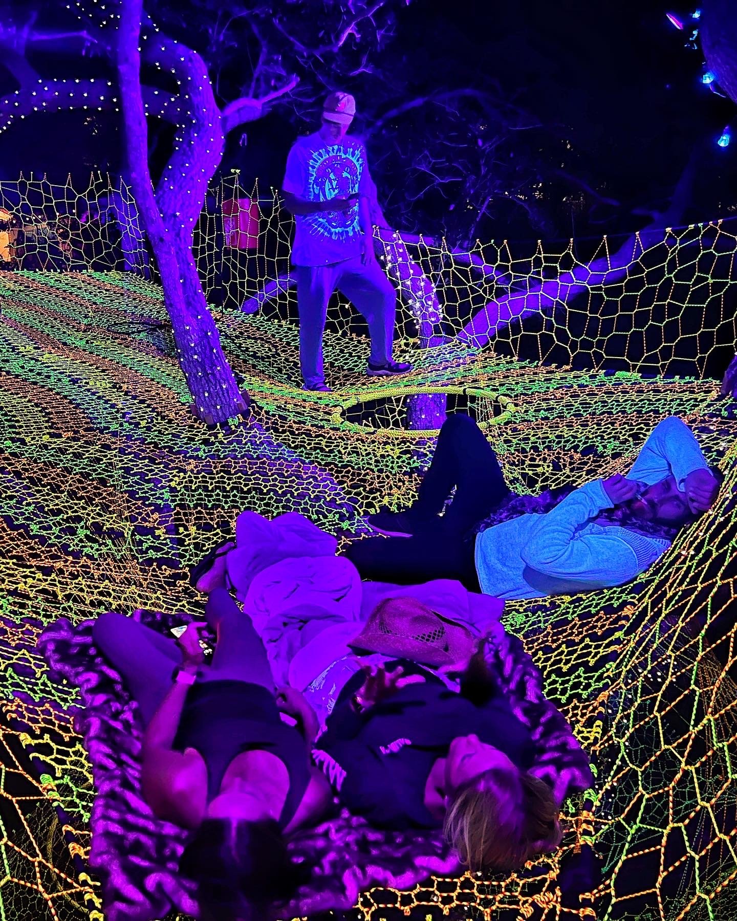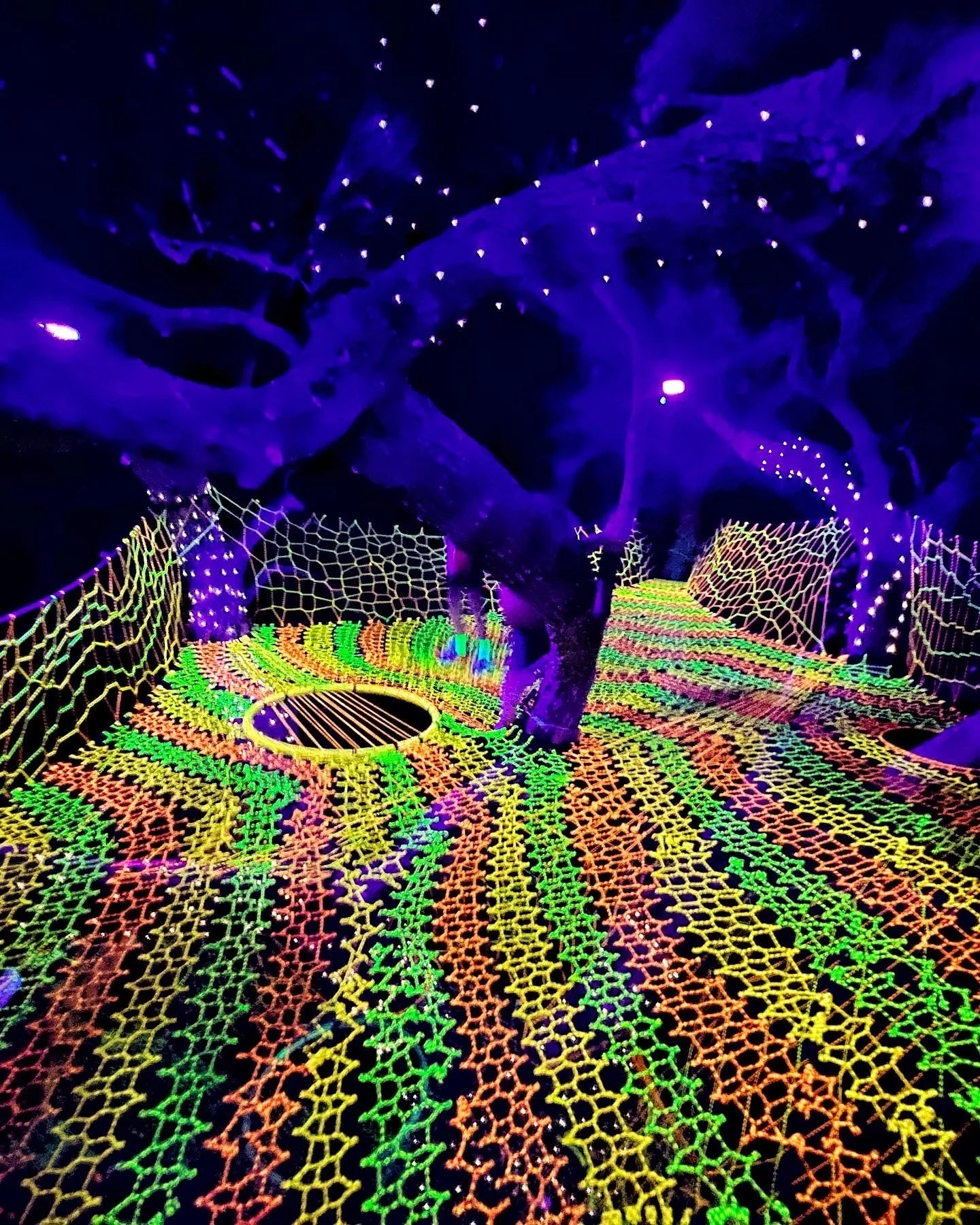 To kick off the 2025 season, we were in Santa Cruz for 6 weeks creating all sorts of unique net installations across the property. Here’s our first and largest piece, the oak grove TreeNet. This natural color theme actually illuminates under UV, converting this organic looking net into a whole new futuristic avatar world at night. With a tunnel entrance and many portals taking you from level to level, this huge backyard net system is just waiting for the kiddos to play and bounce around.