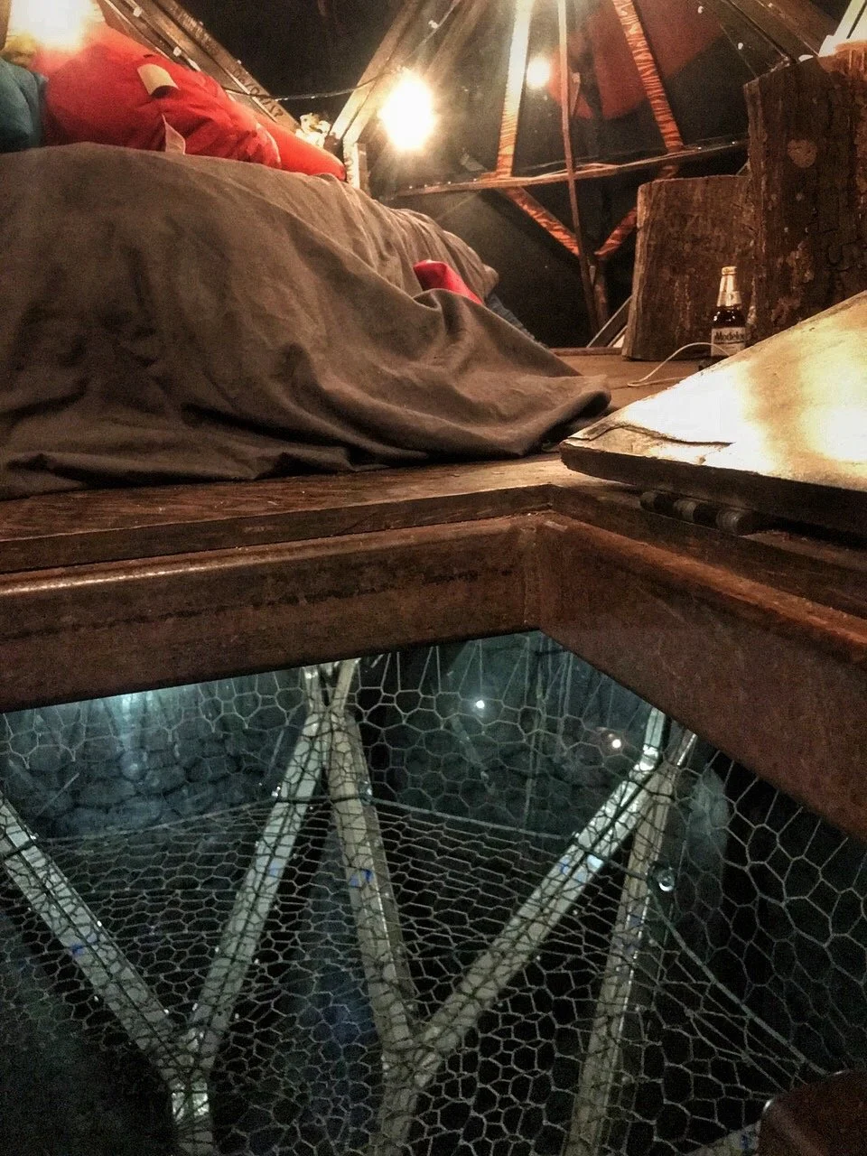 From 2017 - 2022, I lived on the top of a mountain tucked away in a small cabin in the forest. My backyard was filled with many large pine trees that provided the perfect canvas to try my new ideas, patterns, and techniques. Since starting the net in May of 2017, I've slowly added to this monster rope wonderland with leftover materials from other projects. This eight level human hamster cage gives plenty of space to stack all my friends while jamming out to the DJ on level 3. This is the world's first ever fully-suspended rope venue with seating for over 100 people!