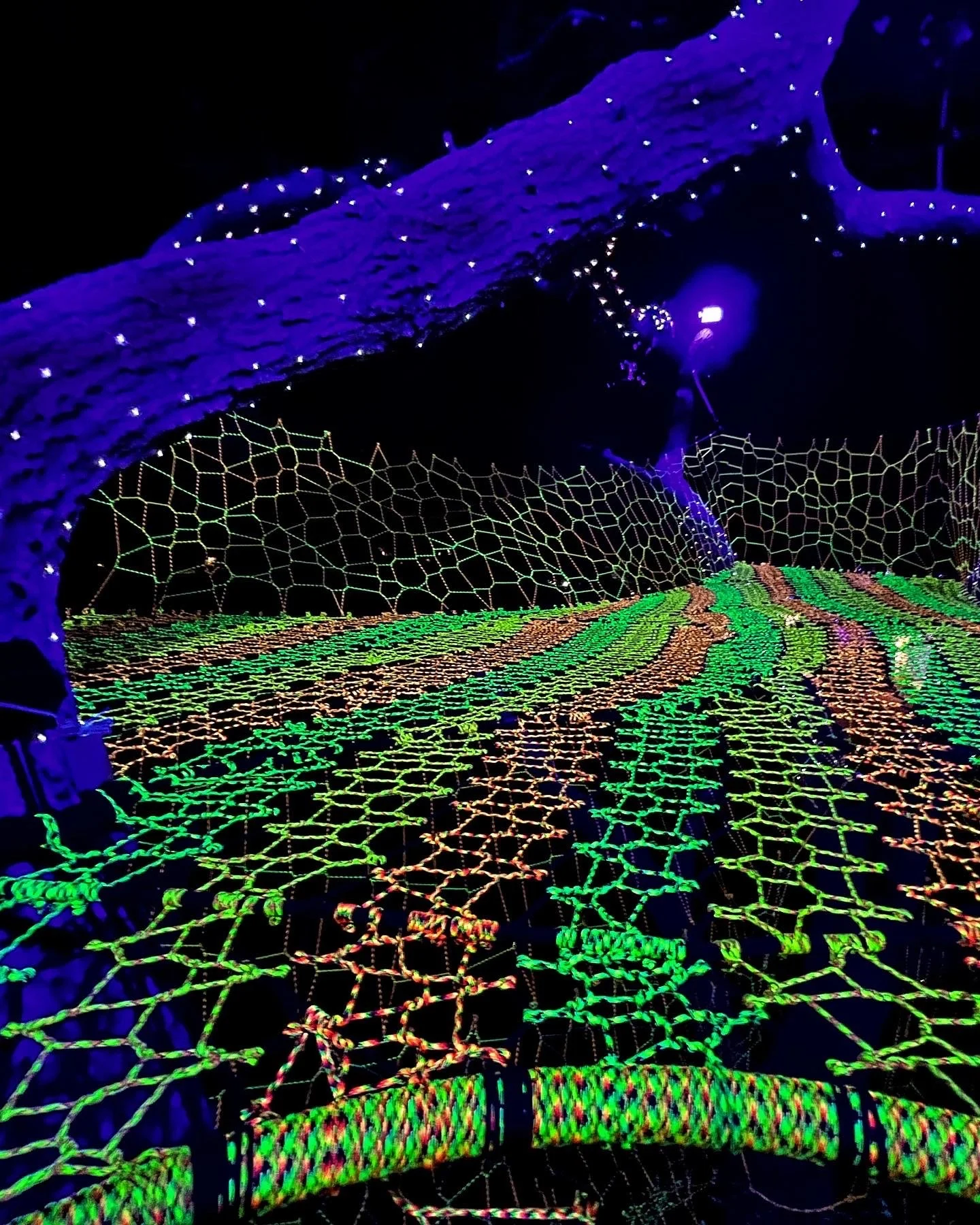The net cube at Arbor Day Farm is a collaboration between the TreeNet Willy team and the team on site. They built us a huge structure of wooden cubes divinding the space into a massive tic-tac-toe grid we were able to fill with unique net platforms, tunnels, climbing walls, and UV designs. Each little cube in here shoes a different pattern or design, giving us the largest variety in weaves to date. It’s more like a dictionary of the patterns we uses a lot and some we just got to experiment and play around with. Come see for yourself and bring the kiddos to this incredible string playground in the trees.