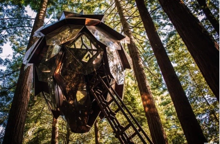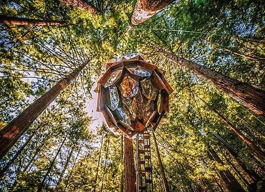 Suspended high in the redwoods, the O2 Pinecone Treehouse sways gently with the wind, offering a one-of-a-kind experience among the treetops. We hand-wove a custom net into the lower section of the pinecone, mirroring its intricate geometric design. The result is a stunning, functional lounge space where guests can relax in the canopy and feel completely immersed in nature’s rhythm.