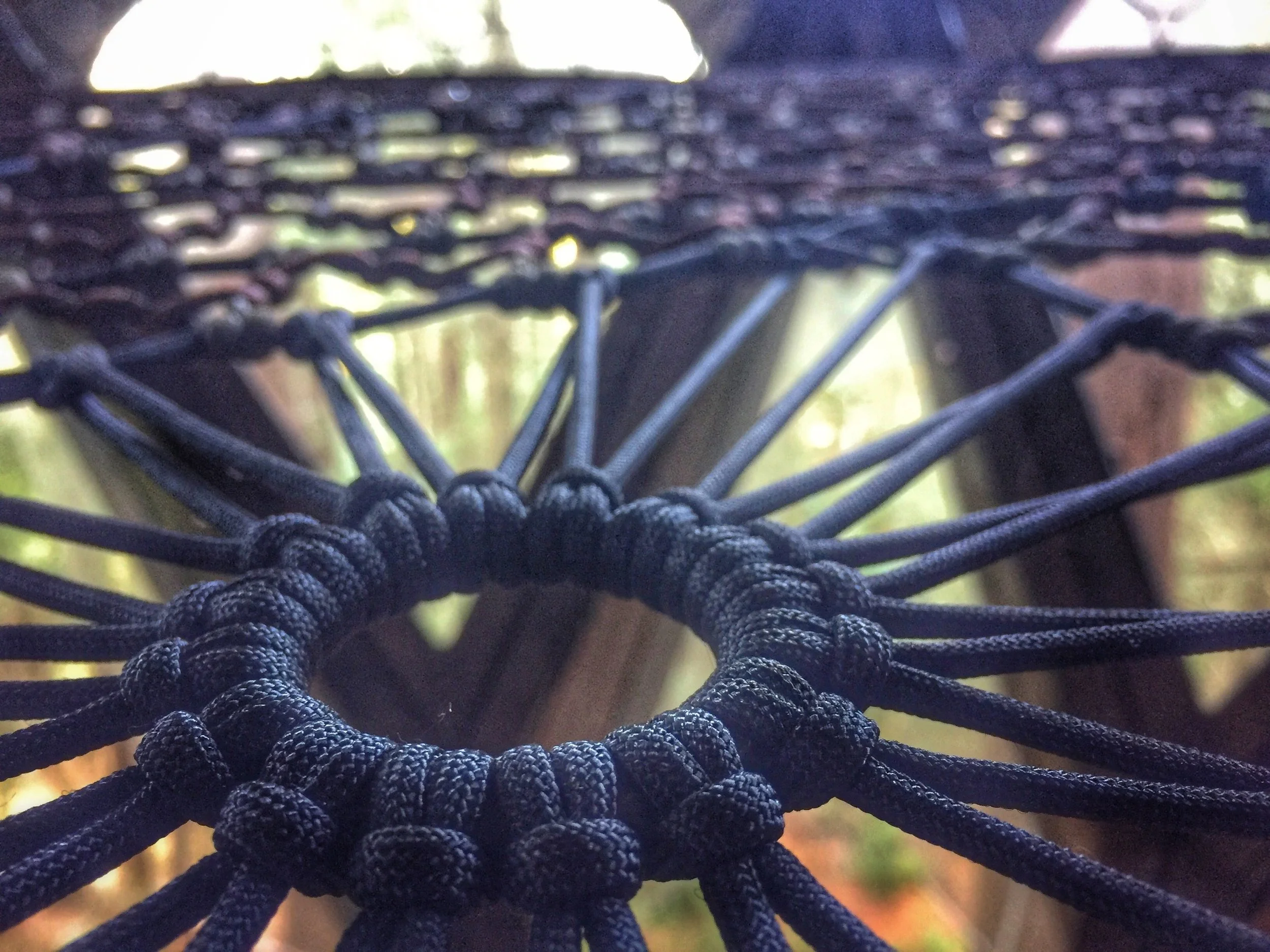 These amazing glass rentals are meant for enjoying the vast surrounding landscape and the northern lights when the season is right. Each unit has a nordic name such as “Thor” or “Odin,” which we wove in nordic runes over the top of the black netting. This was also our first attempt at a ‘worded’ net, as we used a projector to illuminate the webbed grid for our template. Our method worked surprisingly well, so we're eager to try this for other projects including words, logos, or images.
